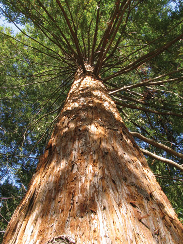 The dynamic life force of the Redwood is demonstrated in its ability to sprout whole trunks from the side of its main trunk. Although these “reiterated” trunks may originate high above the ground, they grow upright as if they were new trees. Dead foliage often collects at the base of these upper trunks, which becomes soil over the decades and centuries, forming an upper ground for other trees and shrubs to sprout and grow.
