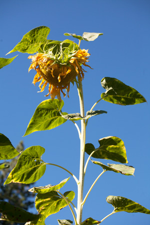 Yet, with all its majestic grandeur, the Sunflower is not exempt from the law of gravity. As the disk florets ripen, Sunflower heads bulge with hundreds of seeds, and the top-heavy weight becomes too much for the stalk to bear. In a gesture of surrender, the Sunflower bends with its weight into the bosom of the Earth, bearing its prodigious gift of seeds for the future (and for our bird friends!).