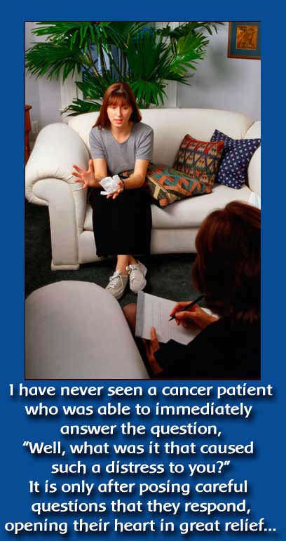 I have never seen a cancer patient who was able to immediately answer the question, “Well, what was it that caused such a distress to you?” It is only after posing careful questions that they respond, opening their heart in great relief. But even then, they never think of relating their soul pain with their illness. Often, cancer patients have much difficulty talking about what has been deeply hurting them, while they may easily talk about other issues of theirs. In many cases, talking with people from the patients’ environments has often provided the essential information which uncovered the basic emotional conflict in them.