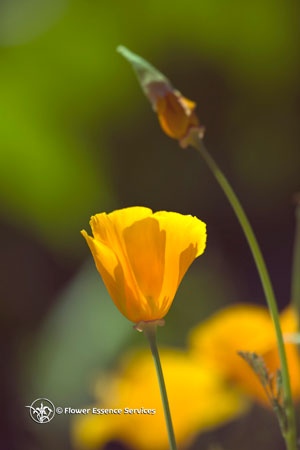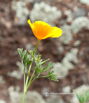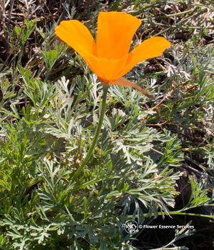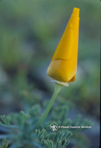 The California Poppy is truly a plant of the sun, opening and closing in response to the radiance of the light and flourishing in open, sunny meadows. The feather-like airy foliage, fiery colors that penetrate even into the leaves and strong seeding process are also indicative of its strong air and fire identity. The archetypal form and gesture of this flower involves the polarity of inner containment and outer movement. The expressive, mobile elements of fire and air which so prominently characterize the California Poppy, are also anchored in its luminous golden chalice.