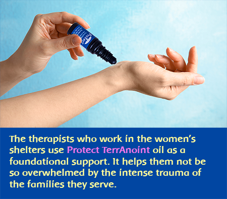 Care for the Caregivers: Protect TerrAnoint & Post Trauma Stabilizer Dr. Natalia Fernández observed that the therapists she trains for the shelter program are acutely overwhelmed by the intensity of the traumatic and painful experiences they encounter in their clients. They find it difficult to maintain emotional distance and to protect their own health and well-being from the effects of the trauma. In fact, stress levels are so high that many shelter therapists can develop severe ailments such as fibromyalgia and even various cancers. Dr. Fernández has discovered that the Protect TerrAnoint Roll-on Formula is a significant and practical support for all members of the shelter staff. The therapists can easily apply the oil at any time while engaged at the shelter. They report an almost immediate dissipation of the “heavy” energy that typically inundates them. In longer term use, the therapists report greater emotional cohesion and safety. This feeling of protection and inner calm allows them to return home without carrying the immense emotional burden of the day. Moreover, Dr. Fernández reports that she can recommend the Protect formula for immediate a situational effectiveness, while also employing more targeted flower essence formulas for the ongoing support of each individual therapist.