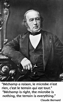 Bach was making an important point here in our understanding of the nature of disease, with its one-sided emphasis on “germs” or pathogens (microbes such as bacteria and viruses). This discussion echoes the nineteenth century dispute between Louis Pasteur (1822-1895), who argued that germs (pathogens) cause disease in otherwise healthy individuals, and his contemporaries Antoine Béchamp (1816-1908) and Claude Bernard (1813-1878) who contended that disease pathogens are opportunistic and thrive in an unhealthy organism, where they find suitable “terrain” or milieu interieur (interior environment).