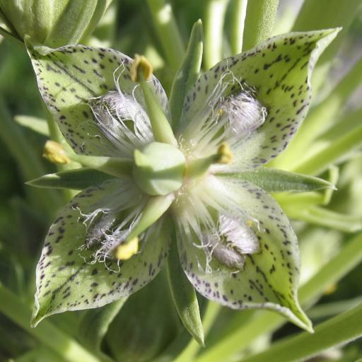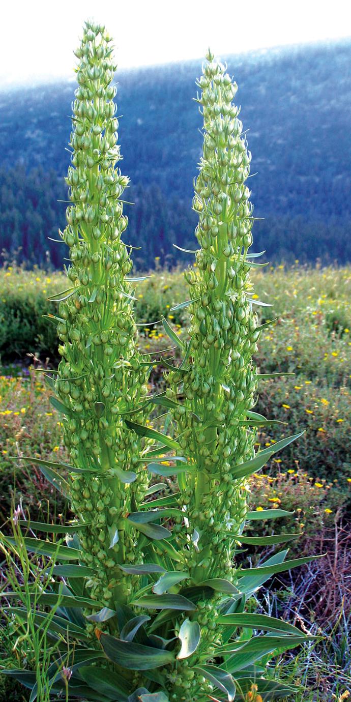 Green Cross Gentian has a gesture that soars toward the sky, like a tall column or obelisk, reaching over two meters in height. Stature is precisely one of its notable characteristics, climbing high into the blue alpine sky in the Sierra Nevada mountains. The leaves and flowers have a conical shape, with green flowers that face outward, strongly attached to a vertical stem. Each flower has four petals that are like compasses indicating the four directions, the four seasons, and the four elements within the larger Being of Nature.