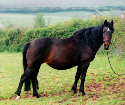 Hefina has only had Molly for eighteen months, but has a good record of the mare's past history up to age four or five. At the age of four, Molly was sent away by her owners to be "backed" by a trainer. In this trainer's hands, she ended up badly injured, bleeding from the ears and nose, hardly able to stand up. Apparently she had tripped over her side reins and landed on her head.