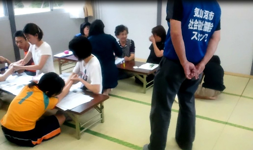 . Because the session took place in the afternoon, a large number of people—about 30—came, and the small meeting place was packed with people. Many of the residents did not know each other before coming to this temporary housing. They seemed to have moved here from many different places. Because the area near the back of the room was regarded as being more “honorable and important” to them, many people modestly huddled together close to the entrance. This time, about half of the participants were men, because many husband and wife couples came to the afternoon session. Members of the volunteer staff escorted them, and the men started sitting near the front. Most residents of this temporary housing were middle-aged and older, and because they did not know each other very well, they rarely chatted with other people who were sitting close to them.