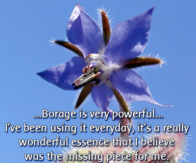 Based on my experience, I feel the light of St. John’s Wort , for me anyway, makes me want to get up out of bed, whereas the light of the Mugwort brings me just this sheltering quietude, which makes me drop off to sleep. When I look at the sun, it hurts my eyes, but moonlight for me is soothing. I love the earth but there is a harsh glare to a lot of things… The moon filters the glare of the sun; it dissolves the glaring harsh edge that typically upsets me. Again reading the Seasons of the Soul brochure explanation of Mugwort Moon Magic, I understood about Mugwort . It spoke of the “alchemy” between the power of the moon and of the sun. Mugwort is a balm of soft moon light for people with the imbalance of the sun-moon light… that was a “lightening bolt”–a key to understanding for me as to how it works. Mugwort helps with severe exhaustion and insomnia, and gives the ability to rest because of the feeling of being protected. Impatiens, Olive and Borage work synergistically with Mugwort I have found that Impatiens and Olive support the work of Mugwort , they are harmonious essences with Mugwort . The Olive addresses the serious exhaustion that I’ve experienced. Olive and Impatiens together take away the tension and allow me to sleep. I recently had an amazing experience because I’ve discovered that one of the essences I rarely use, Borage , is very powerful and I’m so excited—I’ve been using it everyday, and it’s a really wonderful essence that I believe was the missing piece for me. One night I went to bed so late that it was ridiculous, due to having a lot of work, being out late, running errands, and then I had more to do…when finally I allowed myself to sleep, it was so late it was shocking.