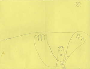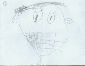 #1   JP's drawing of an anxious boy (himself) trying desperately to stop a ball in a football game. #2   This boy (JP) has an anxious and scared look. Note the tension of the mouth.