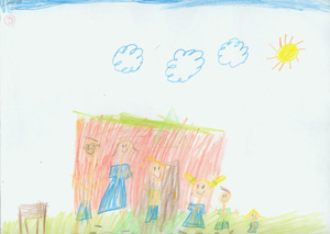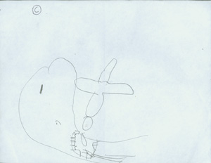 #3 This drawing has no color as in the previous two drawings, and JP described it as a plane that is about to be devoured by a monster. (JP might be considering himself a monster who devours objects?) #4 This drawing has colors and the family seems very happy at home. JP is in the center of the picture and his loved ones surround him. The sky is blue and the sun is shining.