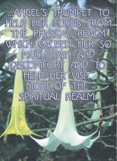 I then introduced B. to the flower essences and told her about Walnut , how it would help her with this transition. I didn’t say “transition from this world to the next” like I usually say, because I didn’t know where she stood at that point. She had always wanted to do everything possible for her recovery, as did her husband. So I said to her, “…this transition from being healthy and walking around to being in bed and being in the hospital.” I also said, “Your children can use it too, because it is a transition for them as well.” I knew as a mother she would feel good about that. Probably her primary and sole concern was really about them. Then, I explained the use of Angelica , to be surrounded by her angels, and Angel’s Trumpet to help her focus from the physical realm which caused her so much pain and discomfort and to help her visit more of the spiritual realm (which I’m sure she’d been to many times).