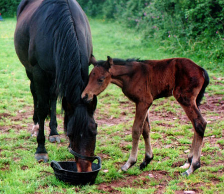 Writing on May 28th, 2001; Molly foaled two days ago - a perfect little colt. She is already proving to be a great mother, and Hefina and others have  had no problems with handling them. We are pretty pleased.