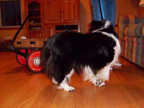 Although she was in good physical condition and was well cared for, Maize was afraid of everything and everyone when her owners brought her to me. She scurried around furiously and her posture was so poor that her legs were barely visible under her body. Her tail was always tucked underneath her. Maize wouldn’t walk on a leash and was frightened of everything and everyone. At our first meeting, at the breeders home, Maize was in a panic trying to find a place to hide and get away from this uncomfortable situation.