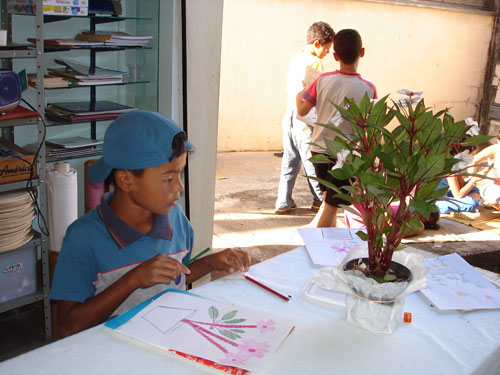 “The children learn about the essences in a playful way. … Now they are very anxious to know about the remedies they’re taking and are interested in talking with me about them. ... and, they are interested in knowing and changing their behaviors. This is a seed for the future, it is rewarding to see their curiosity… I think this is really wonderful for we know that the first step in achieving true healing is to have consciousness of our needs. So, I think this kind of curiosity will lead them to a deeper healing. It also may enhance the actuation of the essences as they continue to take them.” Nineteen children are participating in the art program; they are divided into two classes with fifteen and four children respectively. The class of four children is comprised of the most challenging children attending Núcleo Mãe Maria (NMM). According to Rosana, “The majority of the children at NMM show some sort of difficulty either in learning or behavior. We deal with children from a very poor community and some of them face domestic situations which include violence, abandonment or abuse. “These four children are in very critical condition – at school and at home. They are very aggressive, hyperactive and have difficulty accepting any requests made of them. That is why they are separated from the others. It is very difficult to work with them. “All of the children attending this project are taking flower remedies. They are either my clients or Teca’s (Tereza Cristina), a flower essence therapist on our team.”